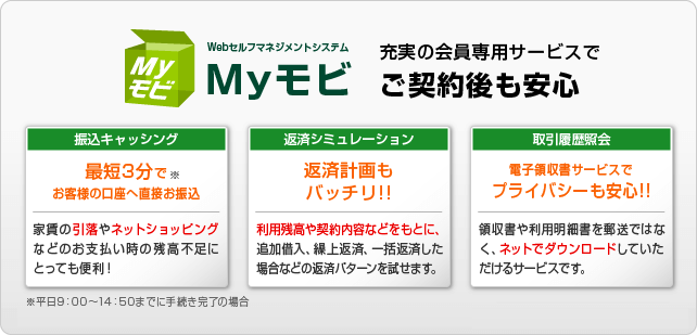 「Myモビ」は利用状況の紹介や返済シミュレーション、借入・返済相談のほか、利用明細をネットでダウンロードできる電子領収書などの安心のサービスが充実しています。